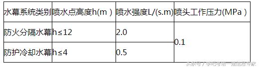 注:1.防护冷反而水幕的喷水点最高点每增加1m,喷水强度应增加0.1L/(s•m),但是超过9m时喷水强度仍然采用1.0L/(s•m)。