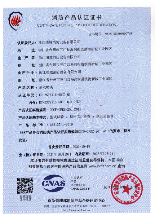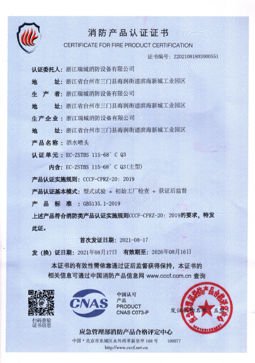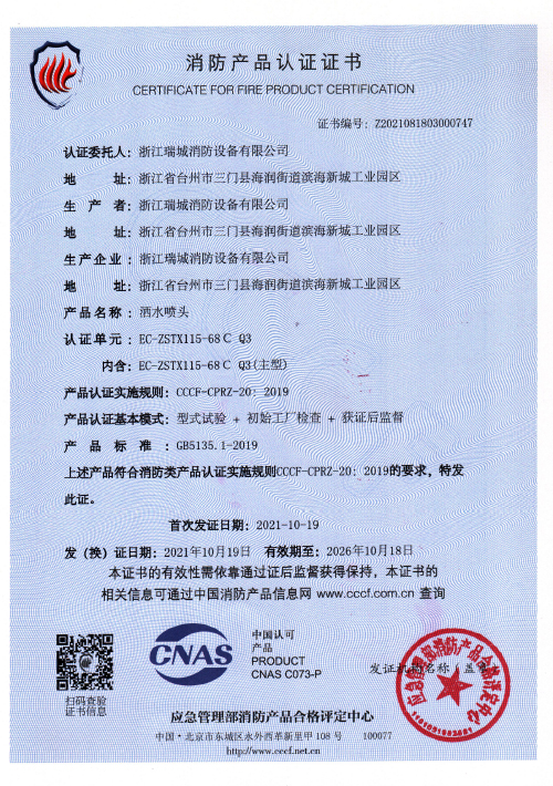 产品标准:GB5135.1《自动喷水灭火系统第1部分:洒水喷头》