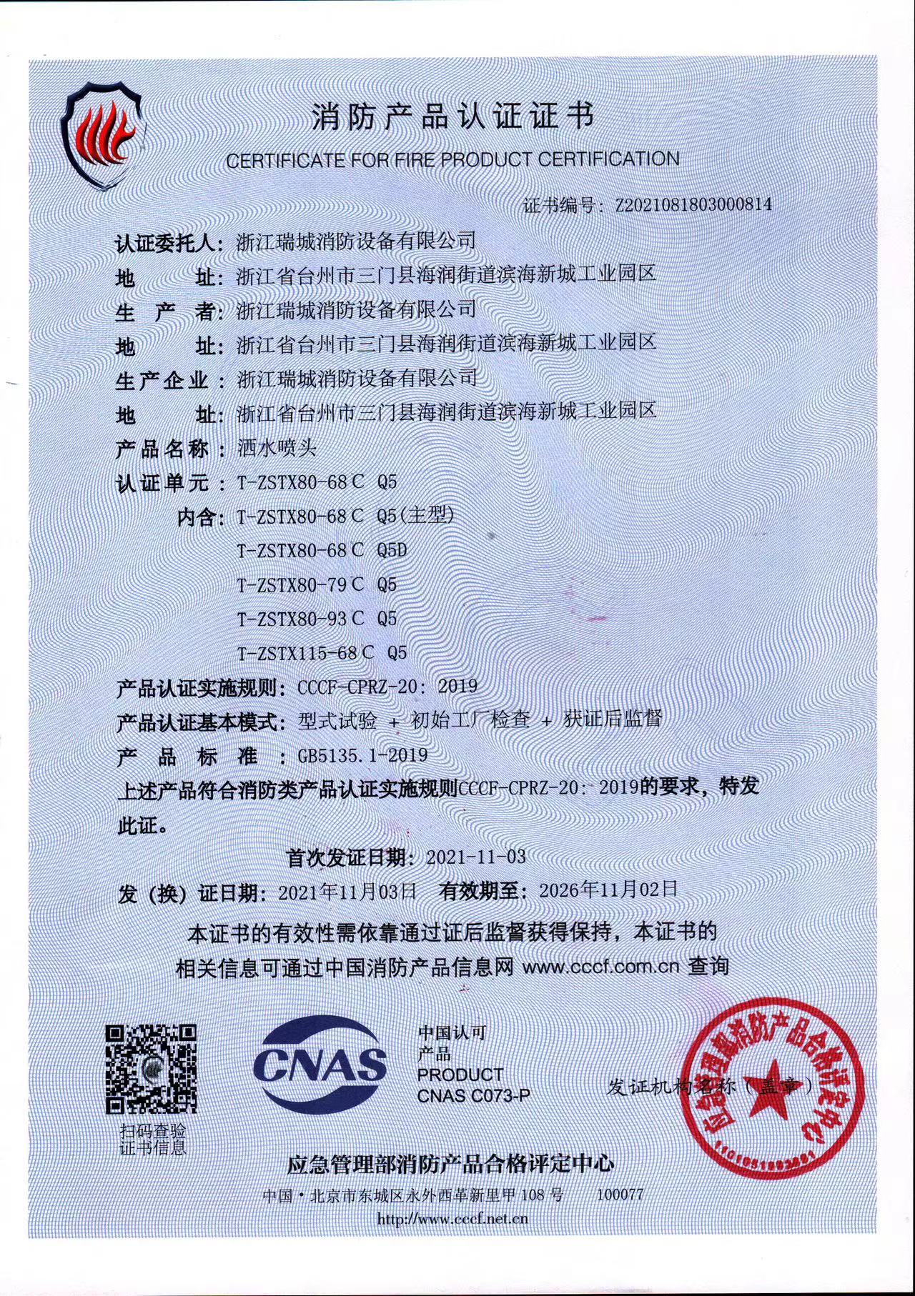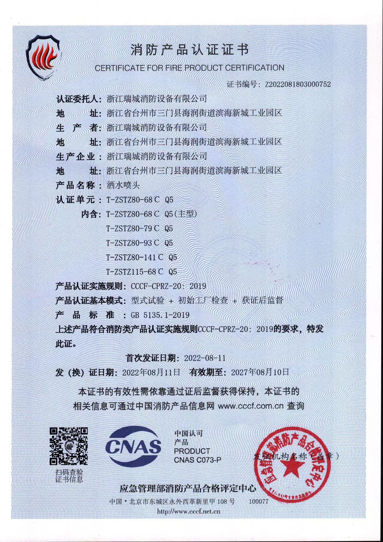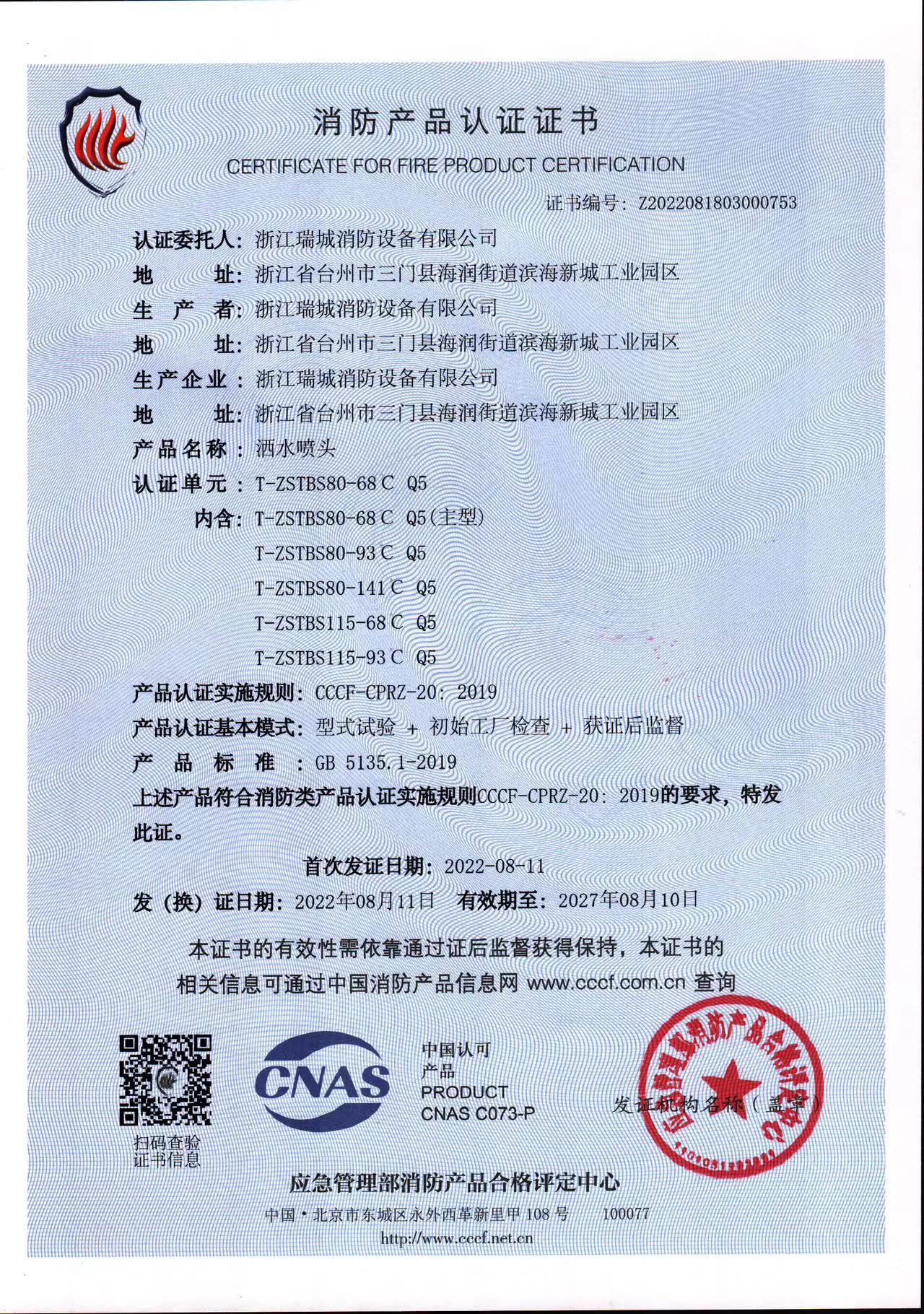 产品标准:GB5135.1 《自动喷水灭火系统 第1部分:洒水喷头》