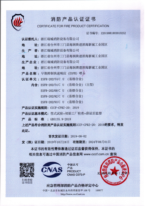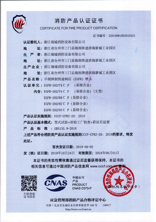 产品标准:GB5135.9《自动喷水灭火系统第9部分:早期抑制快速响应(ESFR)喷头》