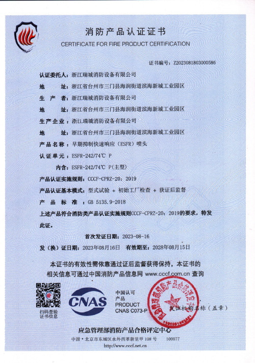 产品标准:GB5135.9《自动喷水灭火系统第9部分:早期抑制快速响应(ESFR)喷头》