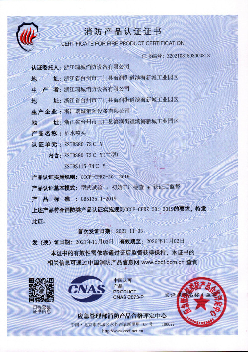 产品标准:GB5135.1 《自动喷水灭火系统 第1部分:洒水喷头》