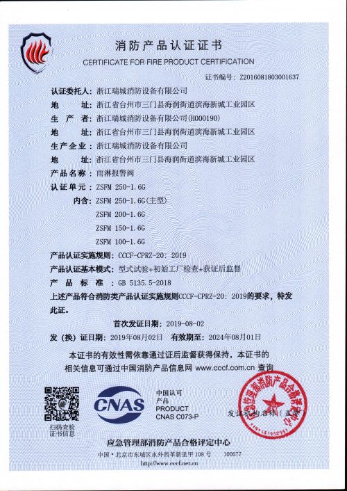 产品标准:GB5135.5《自动喷水灭火系统 第5部分:雨淋报警阀》